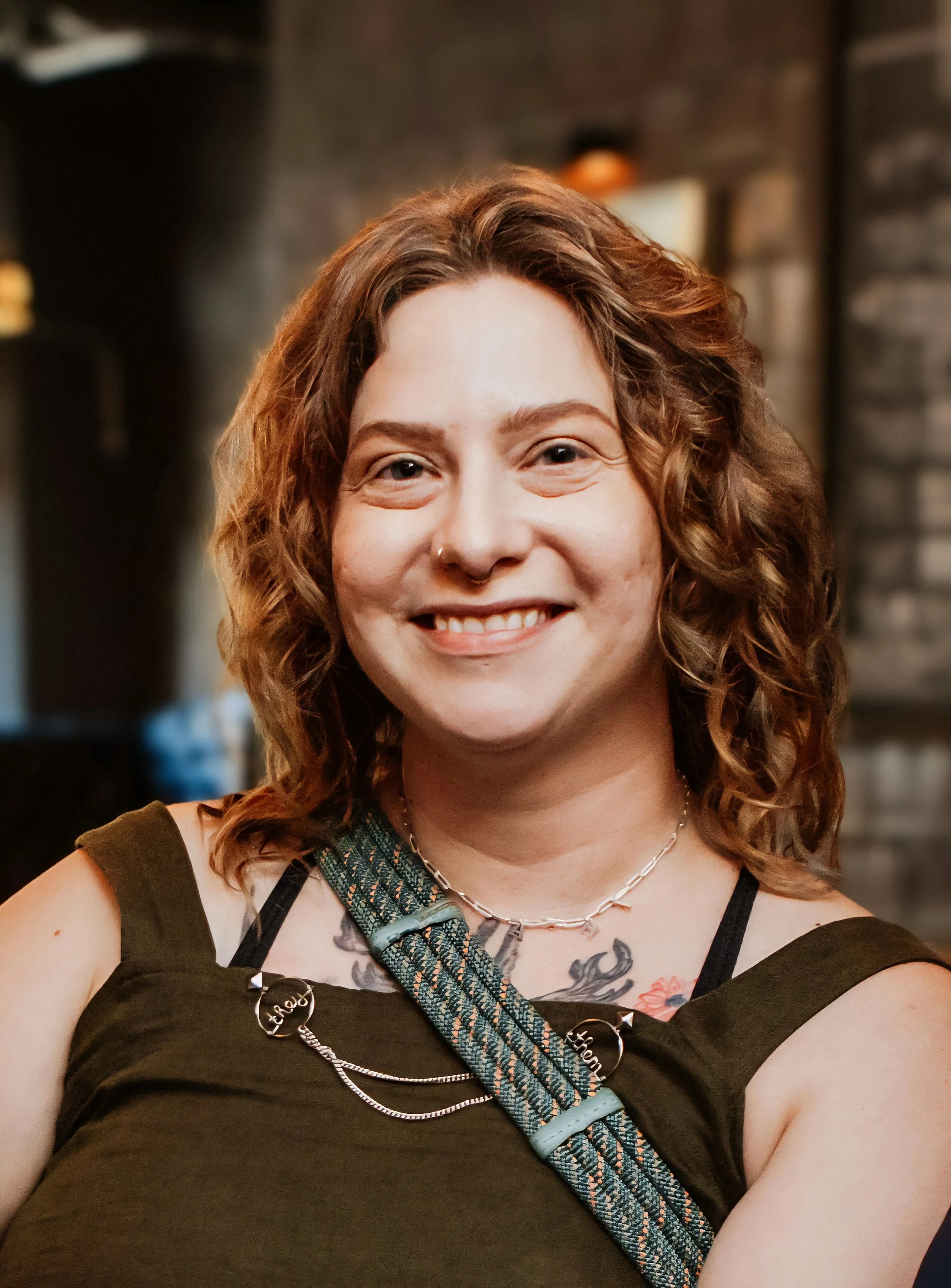 Ashe is a smiling, red-haired nonbinary white person with tattoos.